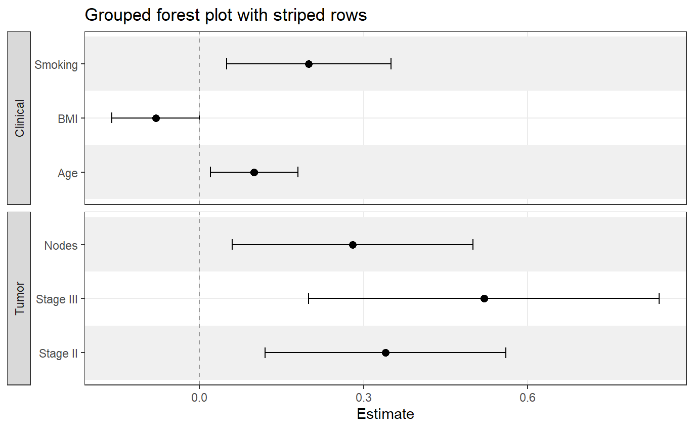 ggplot2::labs(title = "Grouped forest plot with striped rows")